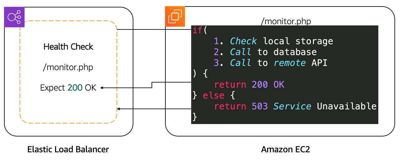 /monitor) that verifies critical dependencies (for example DB connectivity and an S3 call) and returns failure if any dependency fails. [aws.github.io] - Point the load balancer’s health check path to that endpoint so the load balancer can decide whether a target should receive traffic. [docs.aws.amazon.com]