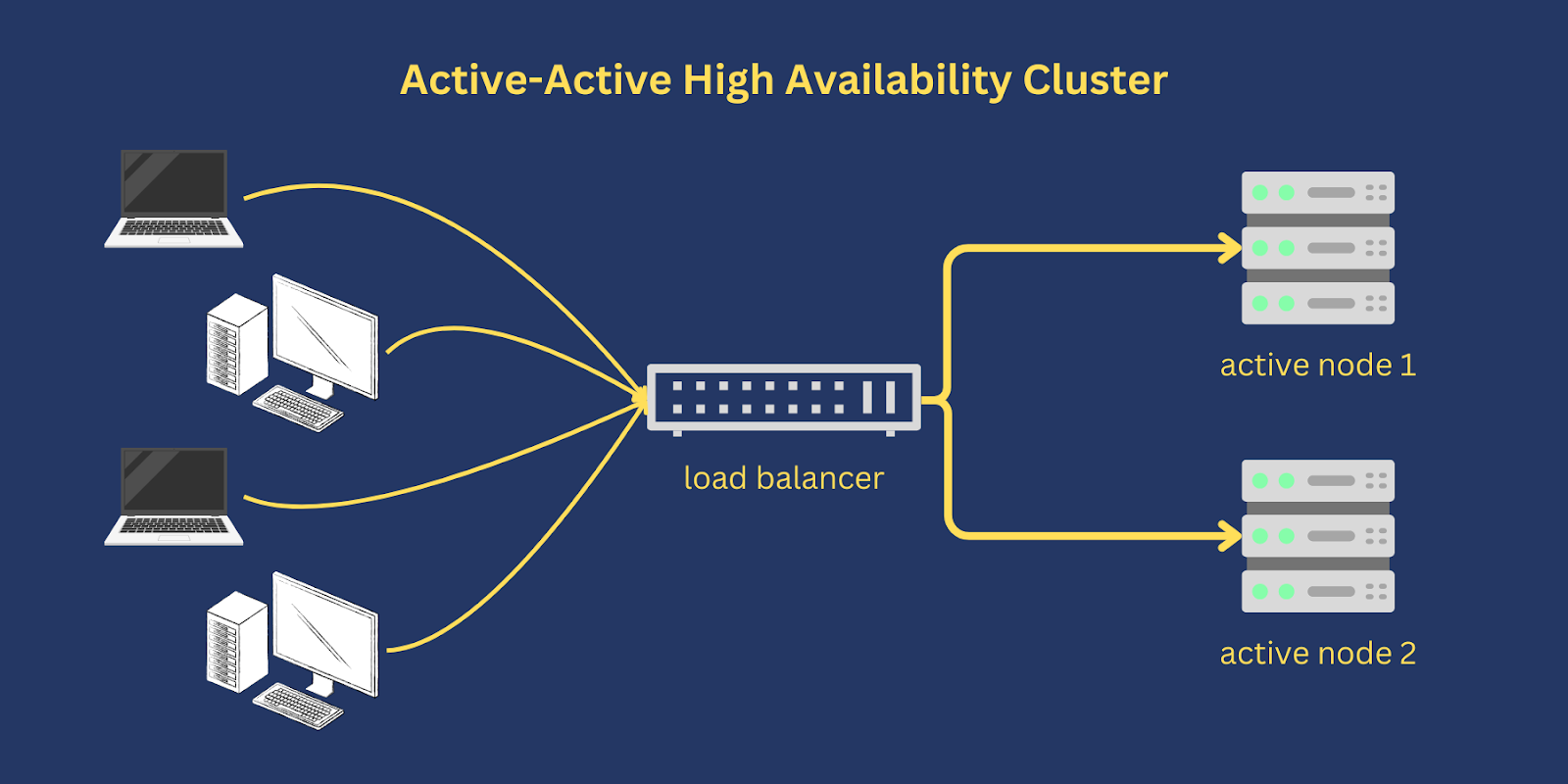 - Active-active clusters rely on a dedicated load balancer for routing or distributing traffic across all participating nodes.