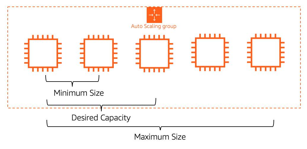 - Minimum, maximum, and desired capacity can be set to different values for dynamic scaling.
