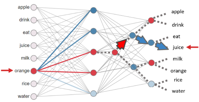 - This is important: instead of predicting the next word (the “standard” training technique), the optimized classifier simply predicts whether a pair of words is good or bad (which makes this a binary classification problem)
