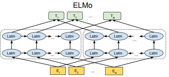 - ELMo assigns each token/word a representation that is function of the entire input sentence