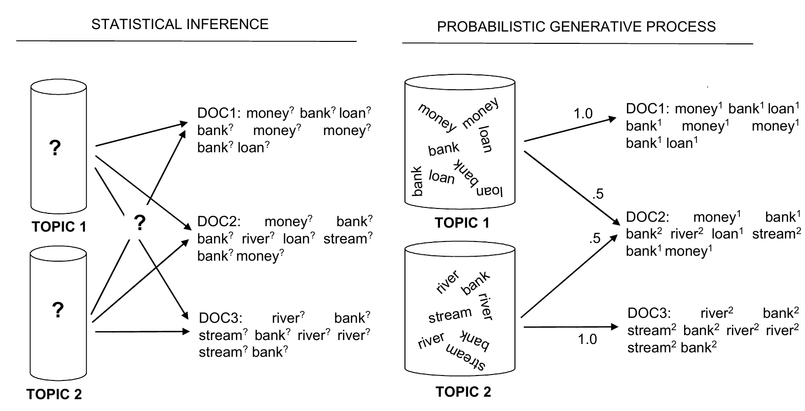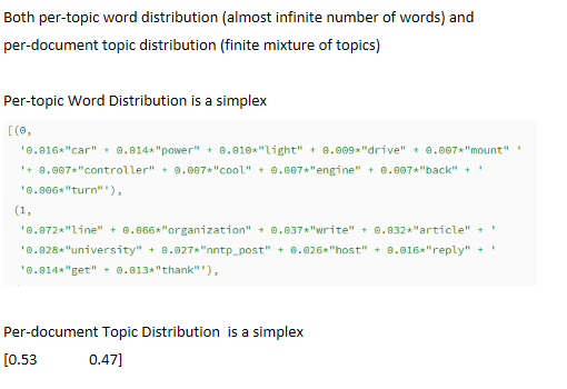 In principle, LDA generates a document based on dirichlet distribution (dd) of topics over documents and dd of words over topics
