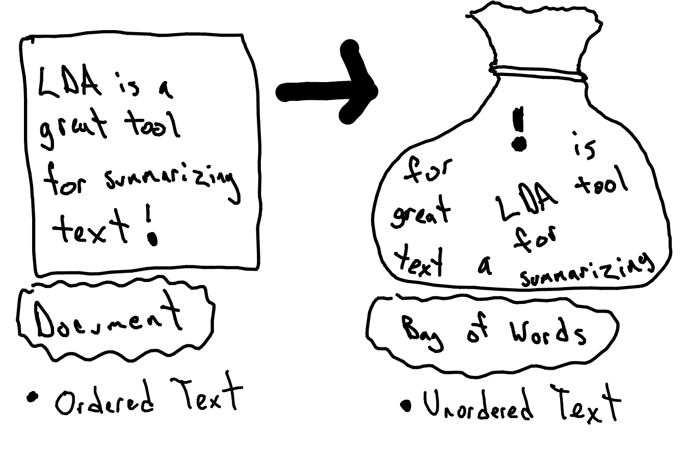 - LDA processes documents as ‘bag of words’ – ordering of words is not important