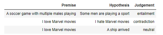 - Do NLI task prediction, where given a premise and a hypothesis, the model is trained to predict whether the hypothesis is an entailment, contradition or neutral to the premise