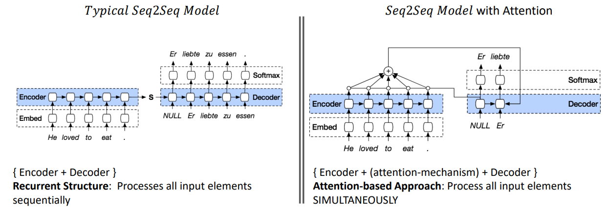 Transformer vs LSTM - Recurrent Structure: Processes all input elements SEQUENTIALLY - Attention-based Approach: Process all input elements SIMULTANEOUSLY