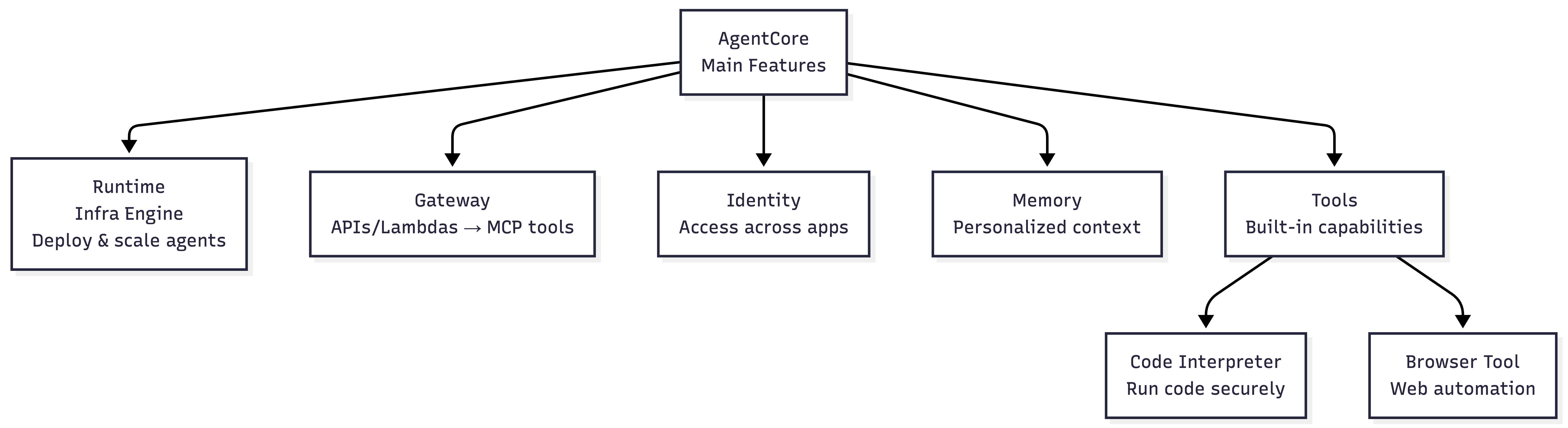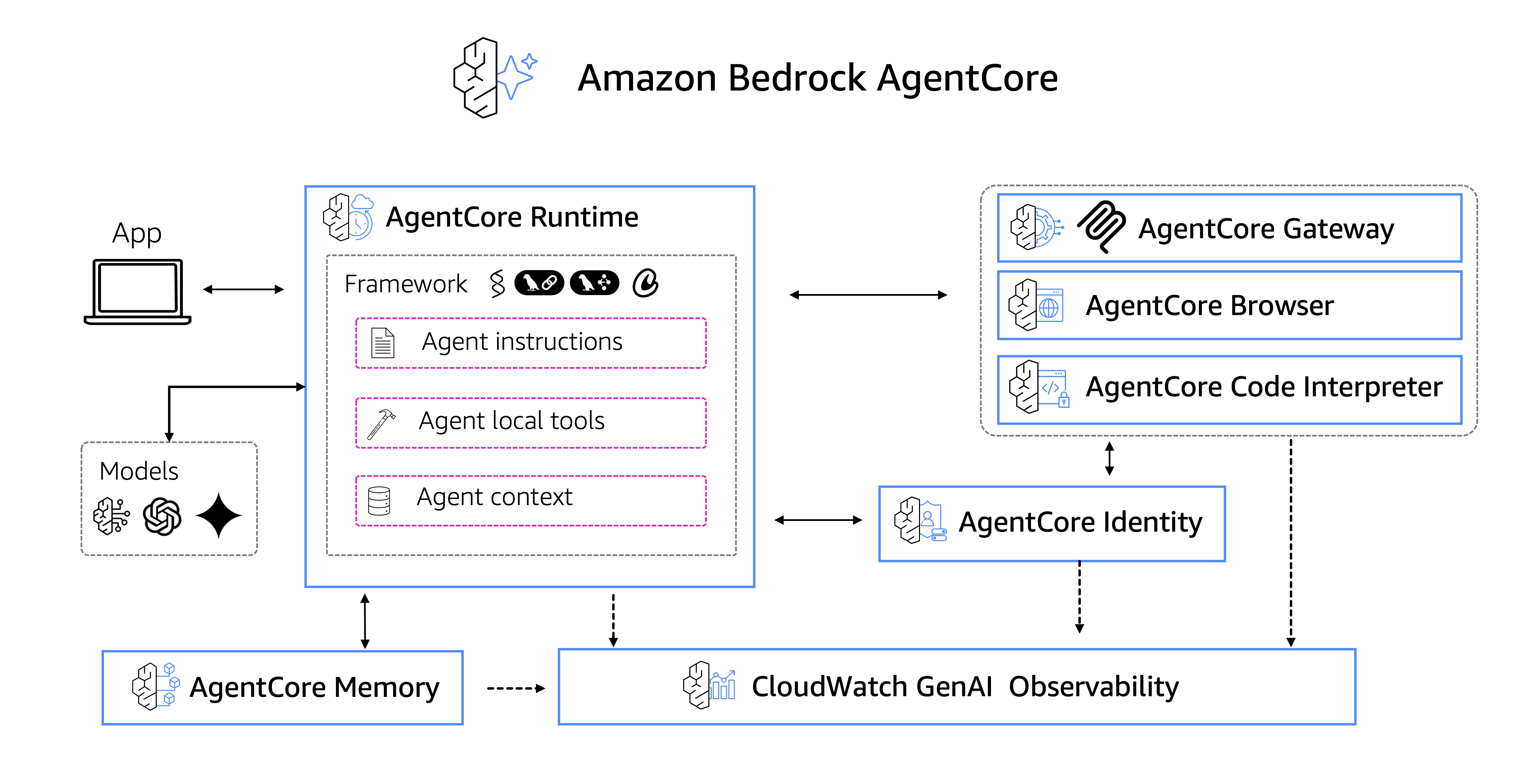 AgentCore is both framework-agnostic and model-agnostic — deploy and operate AI agents securely at scale using any framework (Strands, CrewAI, LangGraph, LlamaIndex) and any LLM. It eliminates the undifferentiated heavy lifting of building specialized agent infrastructure.
