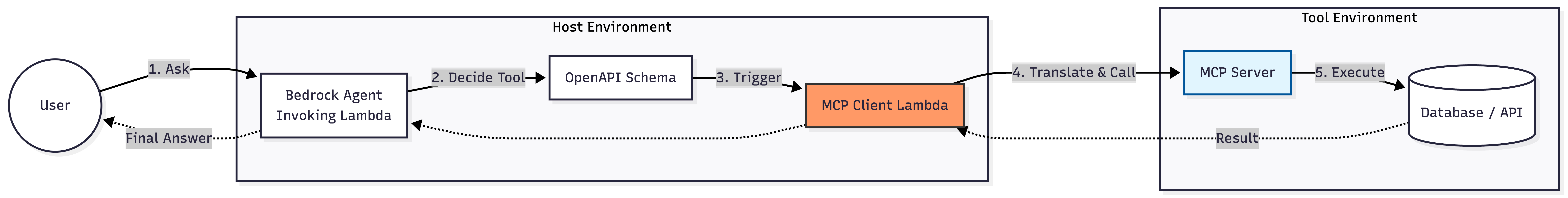 When to use - When you need your existing AWS-managed Bedrock Agent to connect to MCP compatible servers - When you are ok doing some custom plumbing activities