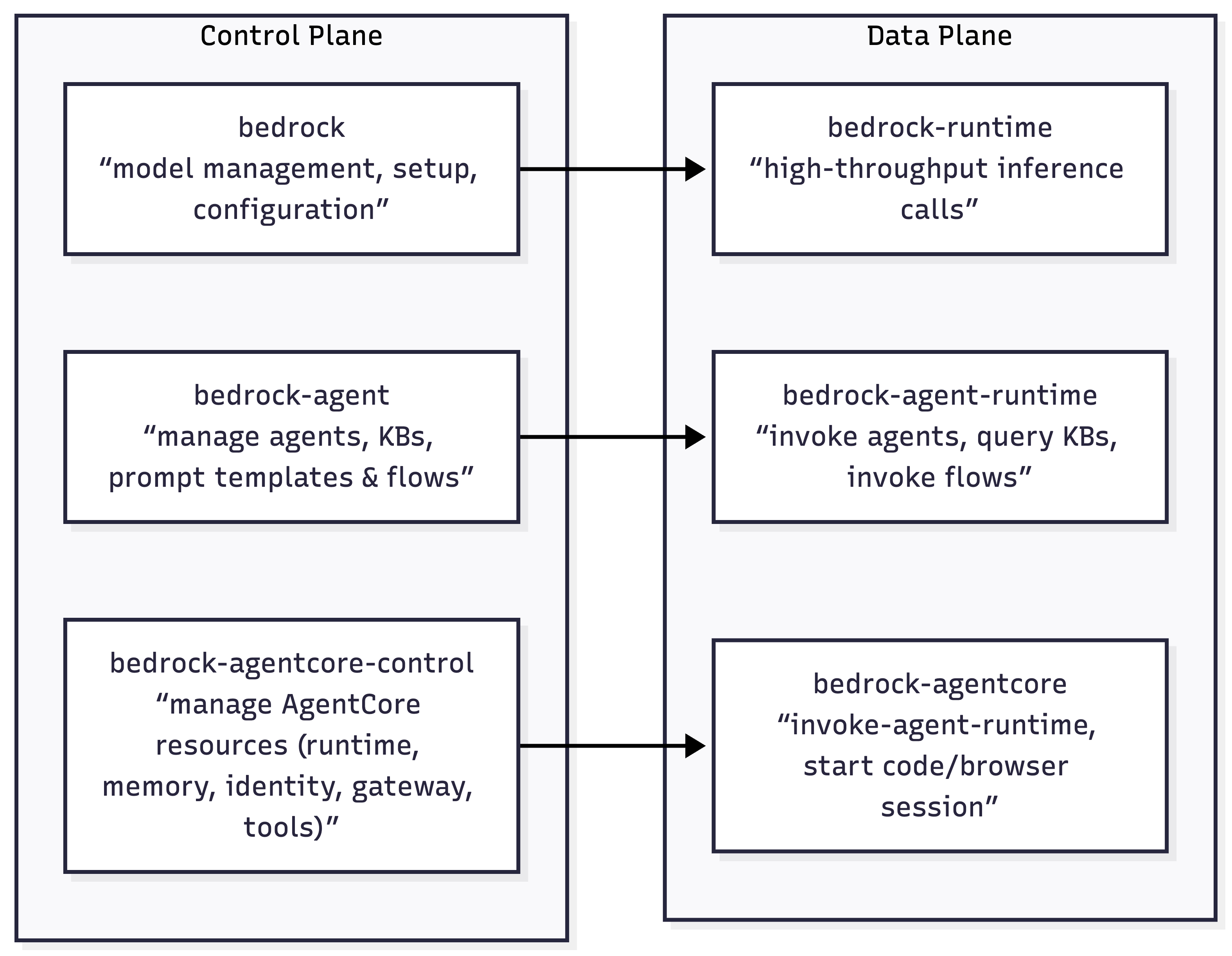 bedrock,bedrock-agent,bedrock-agentcore-controlKey Data Plane APIs: