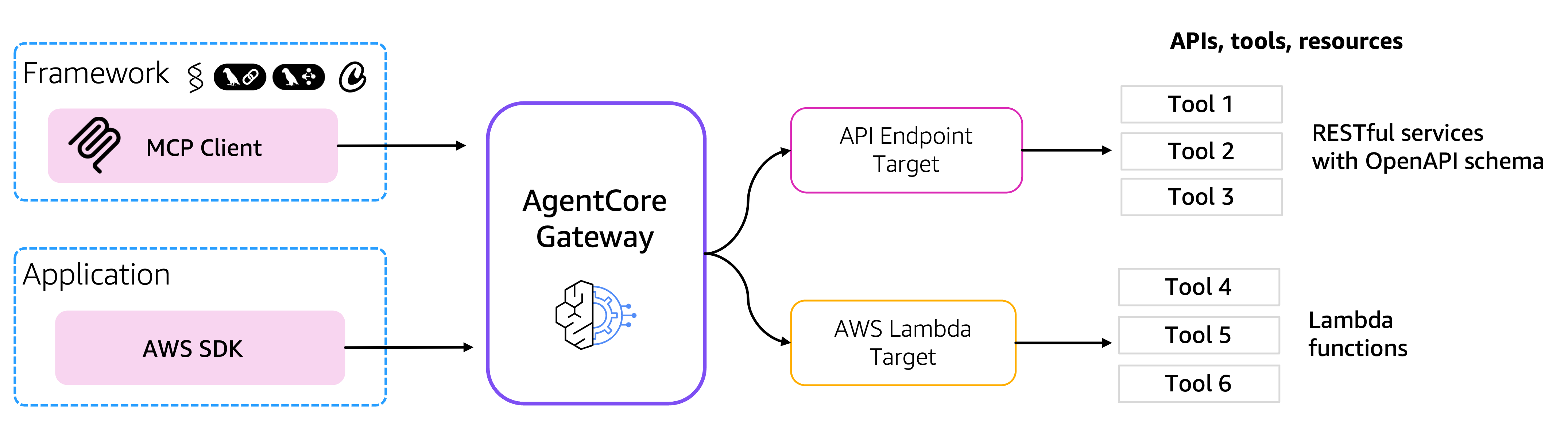 | Gateway | Convert APIs/Lambda into MCP-compatible tools automatically |