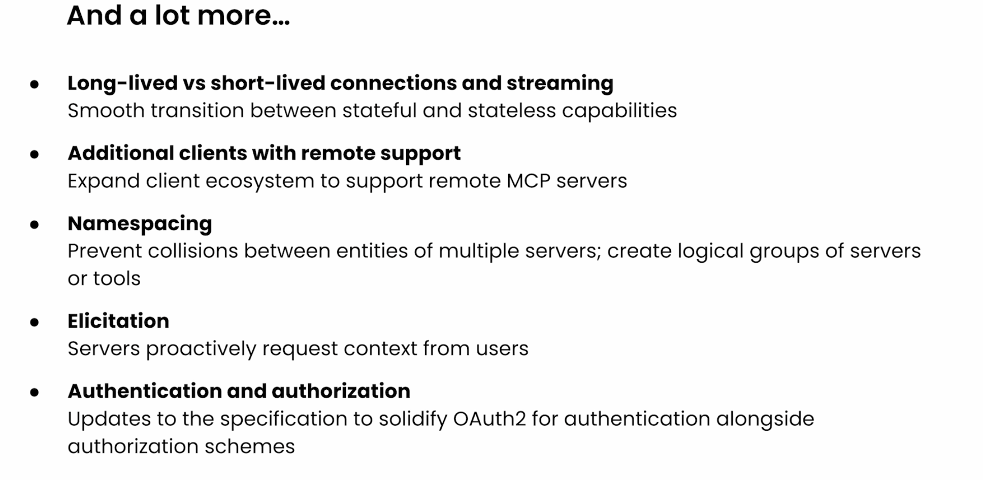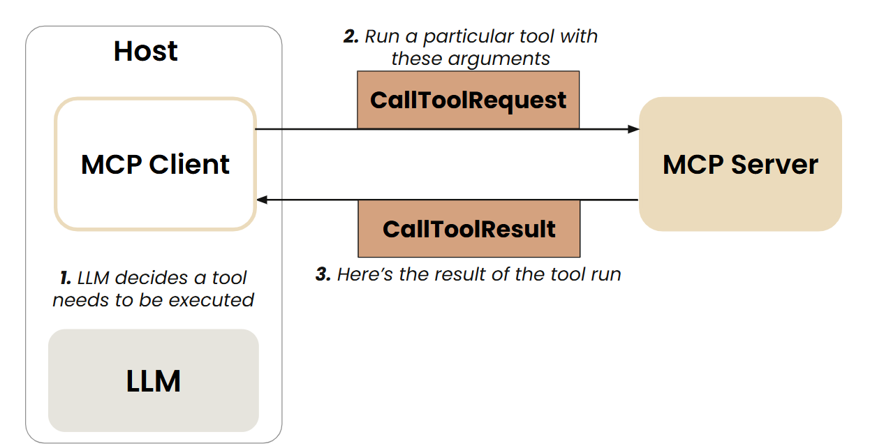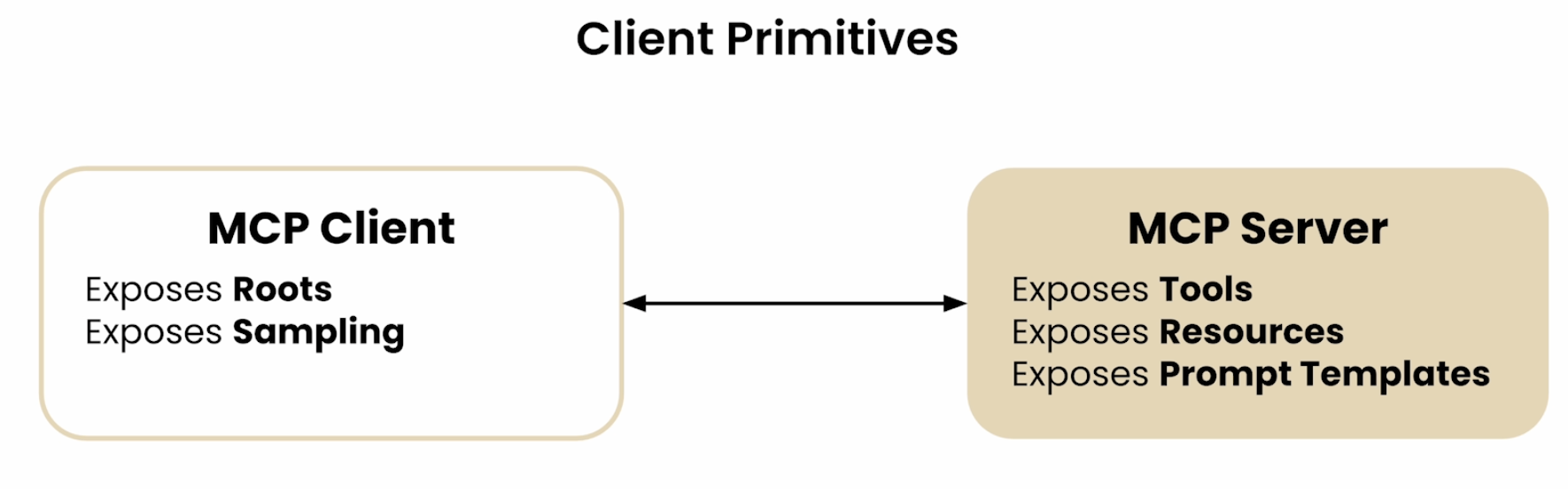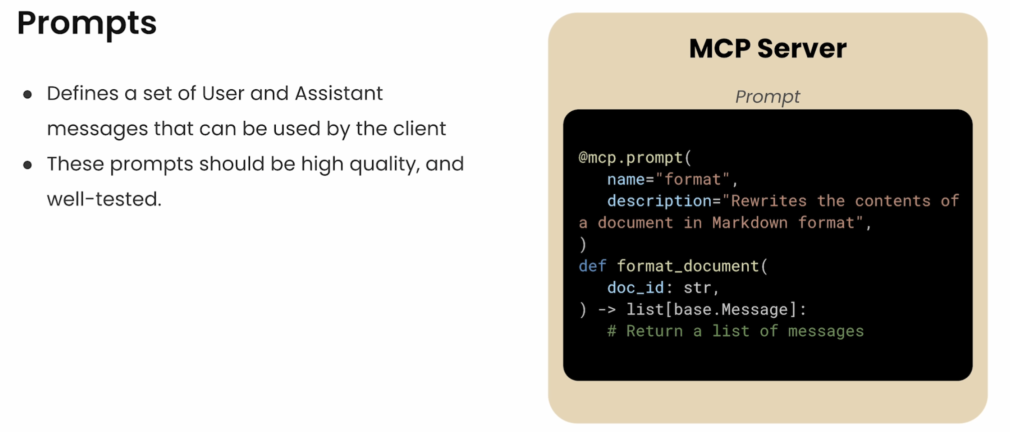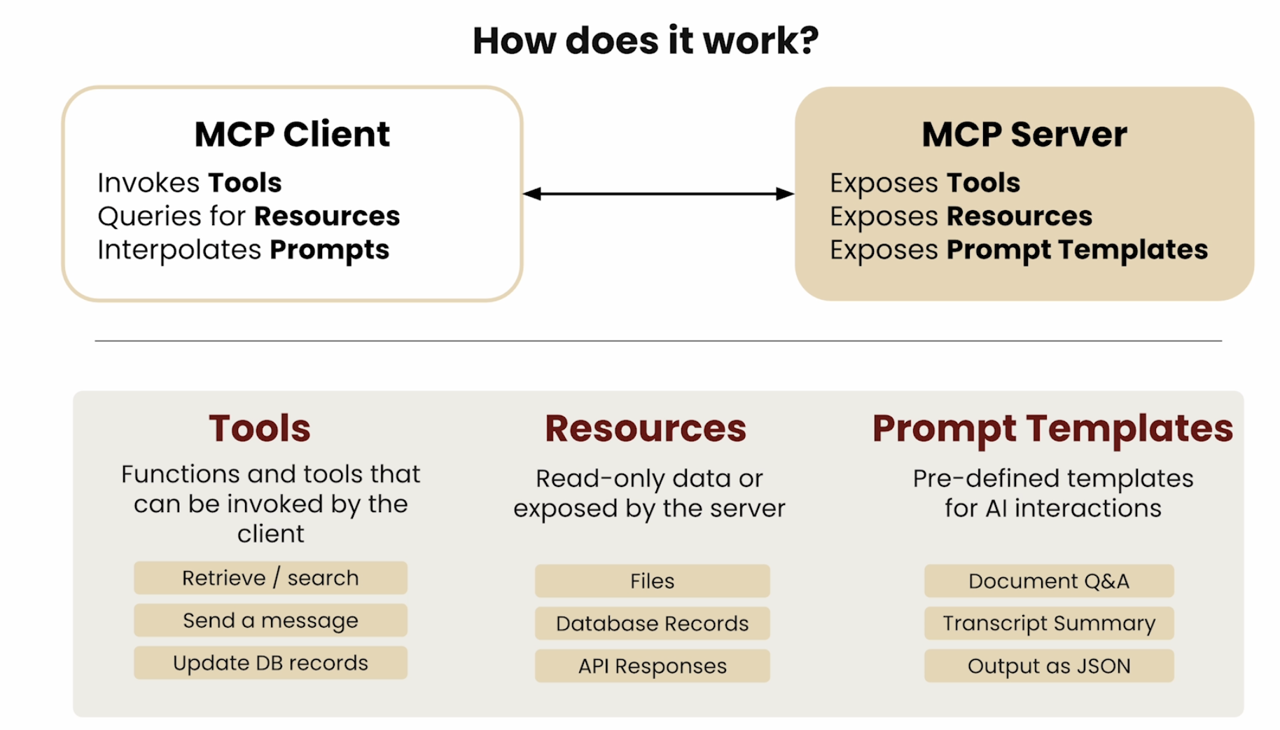 - Tools: Functions & Tools that can be invoked by the client (like “POST” request that does some kind of modification)