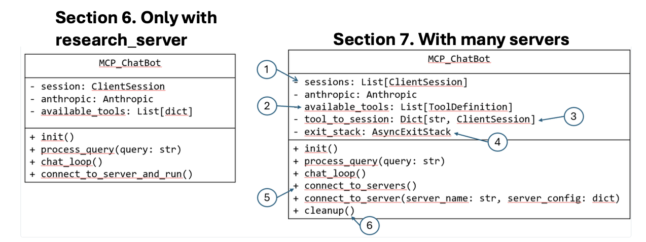 process_query()andchatbot_loop()(that were created in Section #4) are now encapsulated insideclass MCP_ChatbotThe course materials used a package manager called uv (uv, built in Rust, is a Python Package Manager)