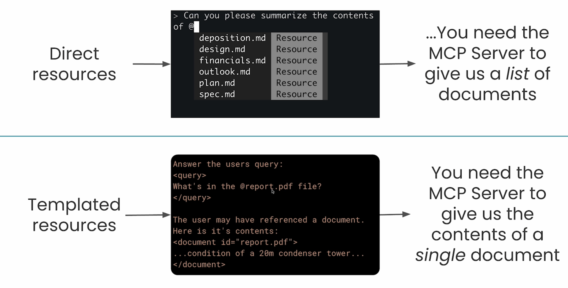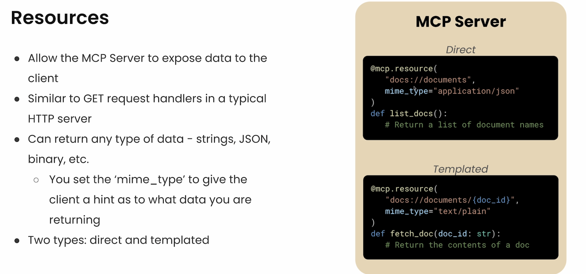 - Resources: Read-only Data or Context exposed by server (mostly read-only) (like “GET” request)