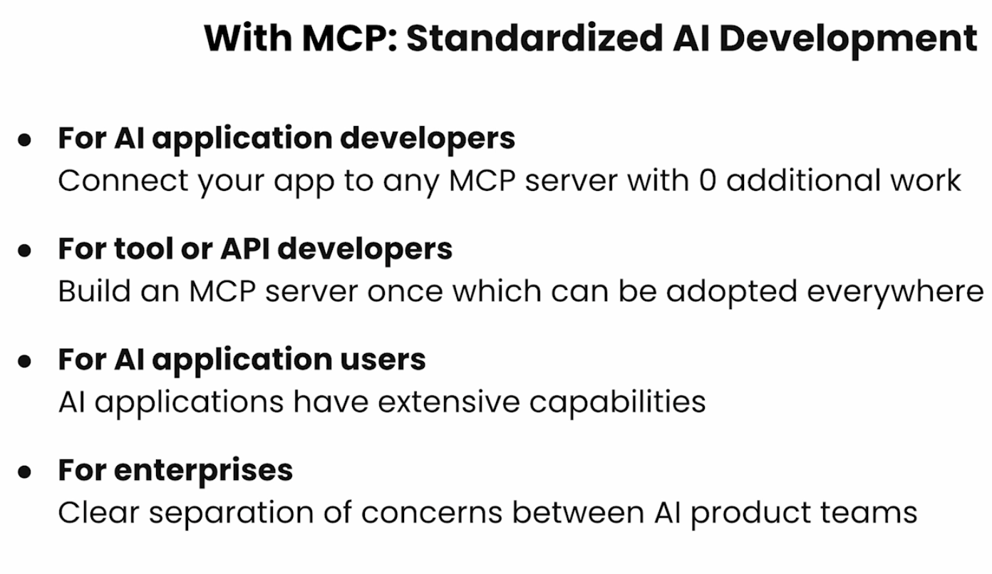 MCP is not just useful for AI developers to help them connect their AI/LLM to many data and tools, it is helping tool/API developers make their tool available to multiple AI applications