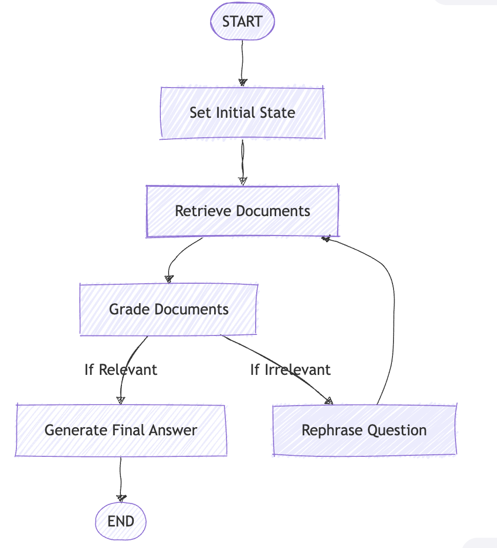 - Grades relevance of retrieved documents using GPT-4.1-mini: