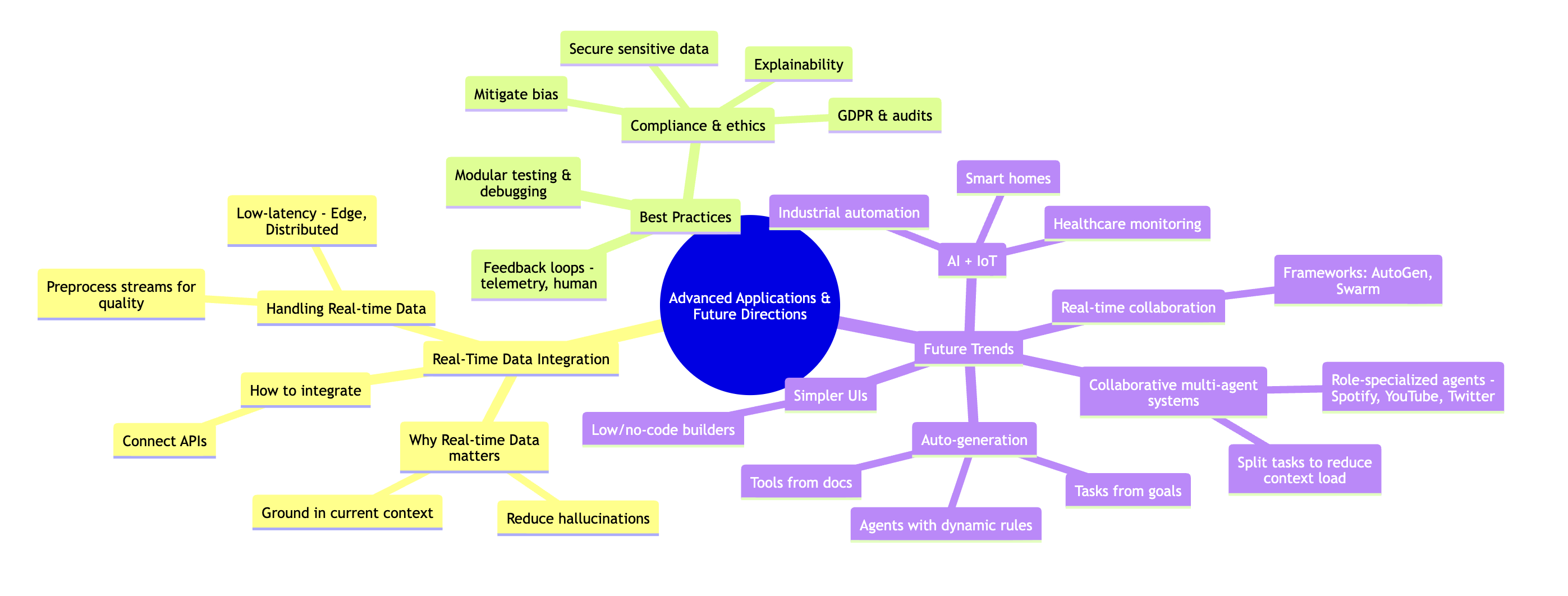 Advanced Applications and Future Directions - Real-time data integration, modular testing, and ethical compliance are critical. - Future trends: AI + IoT, collaborative multi-agent systems, auto-generation of tasks/tools/agents, and simpler UIs for non-technical users.