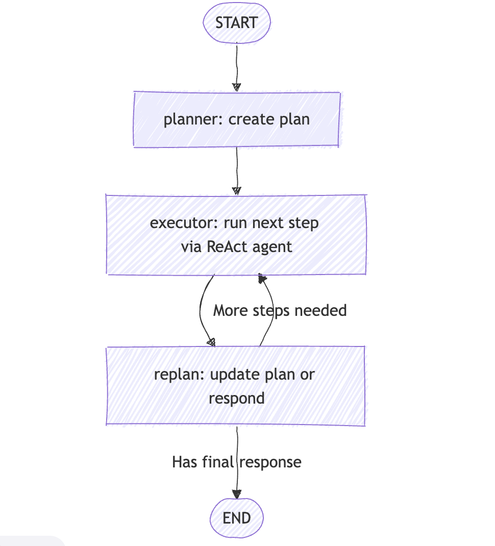 planner: Creates the plan from the user input.executor: Formats and executes step 1 with the ReAct agent.replan: Decides to respond or refine the plan.